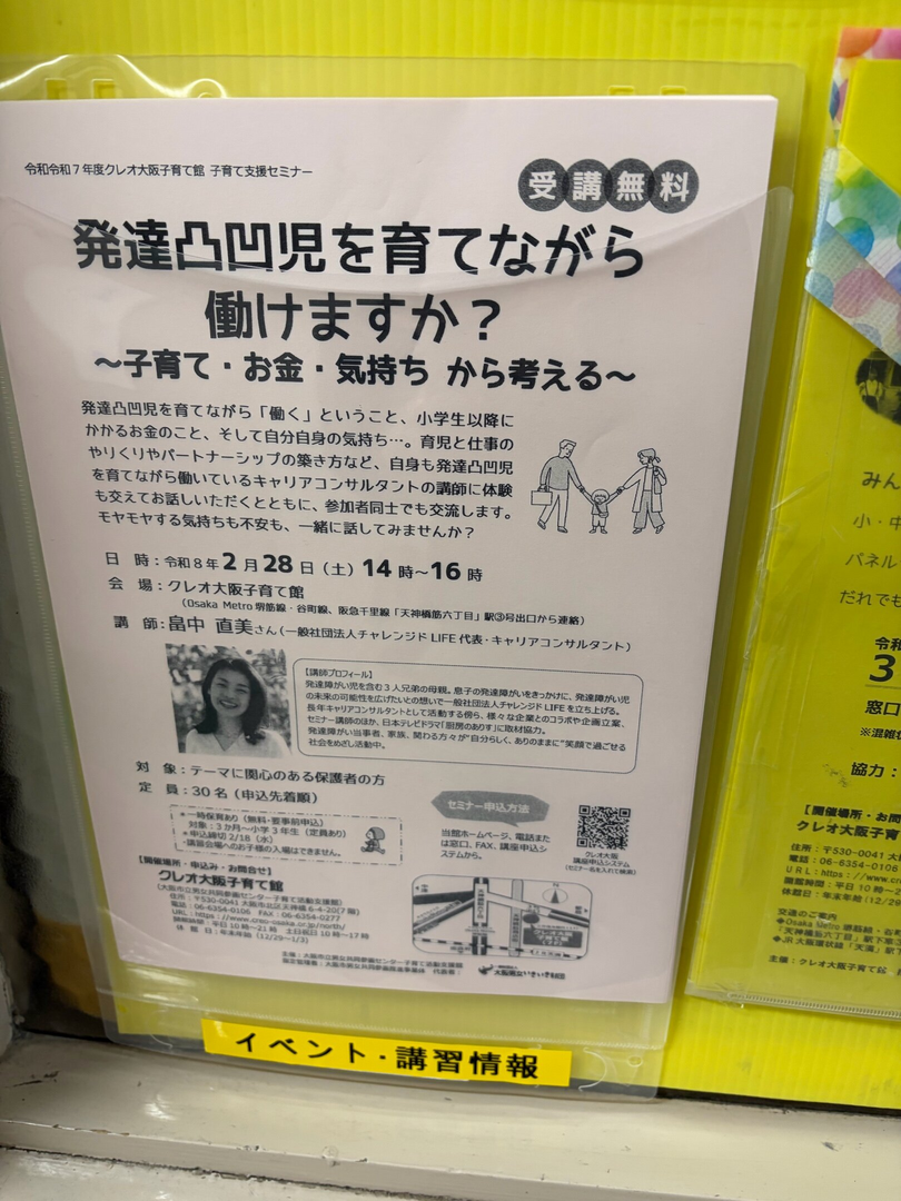 発達凹児を育てながら「働く」ということ、小学生以降にかかるお金のこと、そして自分自身の気持ち…。育児と仕事のやりくりやパートナーシップの築き方など、自身も発達凸凹児を育てながら働いているキャリアコンサルタントの講師に体験も交えてお話しいただくとともに、参加者同士でも交流します。