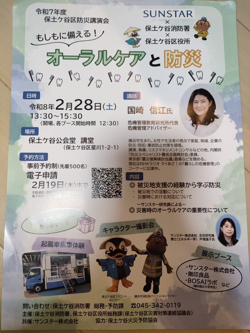 2月28日(土)に保土ケ谷公会堂で「オーラルケアと防災」が開催されます。被災地支援の経験から学ぶ防災や、災害時のオーラルケアの重要性についての講演があります。起震車乗車体験やキャラクター撮影会もあり、お子様も楽しめます。展示ブースも設置されます。講演は事前予約制で、先着500名です。手話通訳をご希望の方は、電子申請の際にご記載ください。