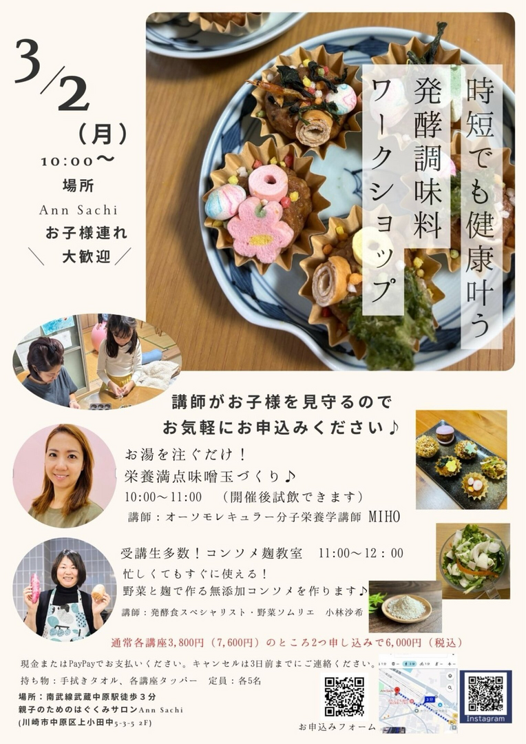 来月3月2日に、10:00-11:00 味噌玉作り(試飲あり)、11:00-12:00 コンソメ麹作りを行います。通常各講座3800円のところ、2つの講座に参加される方は特別価格6000円(材料費込み)で参加できます。もちろん、どちらか1つだけの参加も可能です。