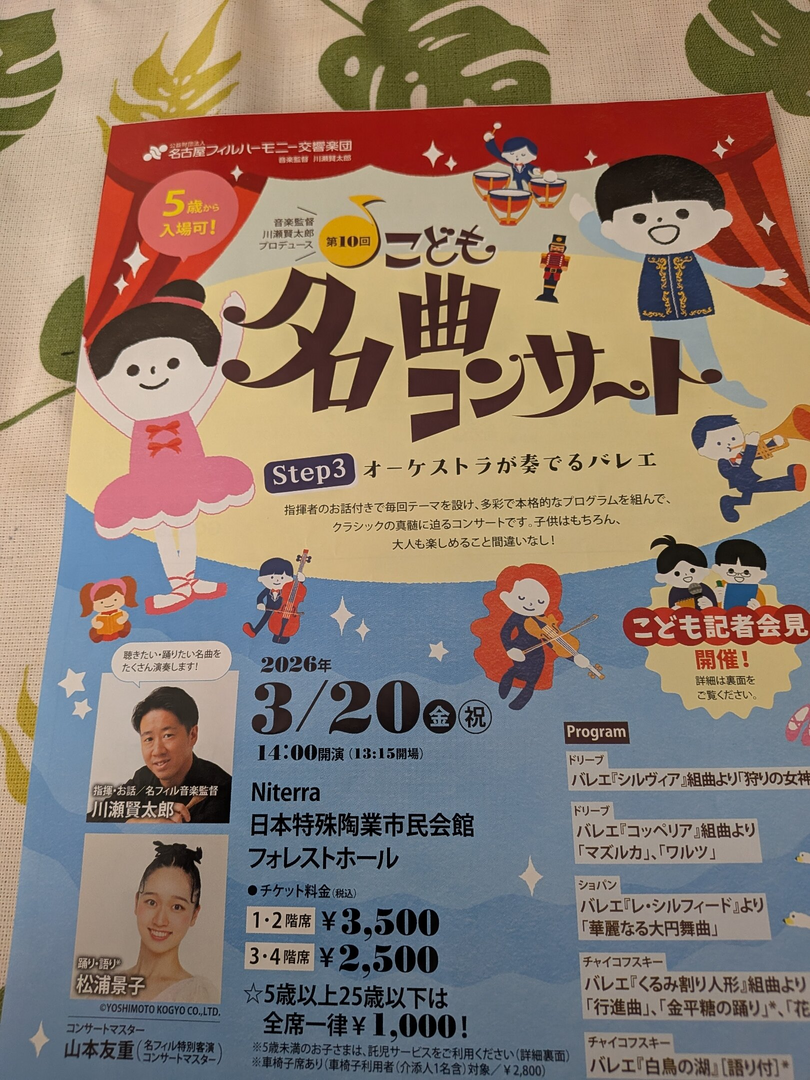 名古屋フィルハーモニー交響楽団によるコンサートが開催されます。5歳から入場可能で、音楽監督の川瀬賢太郎がプロデュースする第10回こども名サートです。オーケストラが奏でるバレエをテーマに、指揮者のお話付きで多彩で本格的なプログラムが組まれています。子供はもちろん、大人も楽しめる内容です。こども記者会見もあり、聴きたい・踊りたい名曲をたくさん演奏します。チケット料金は1・2階席が3,500円、3-4階席が2,500円で、5歳以上25歳以下は全席一律1,000円です。5歳未満のお子さまは託児サービスをご利用ください。