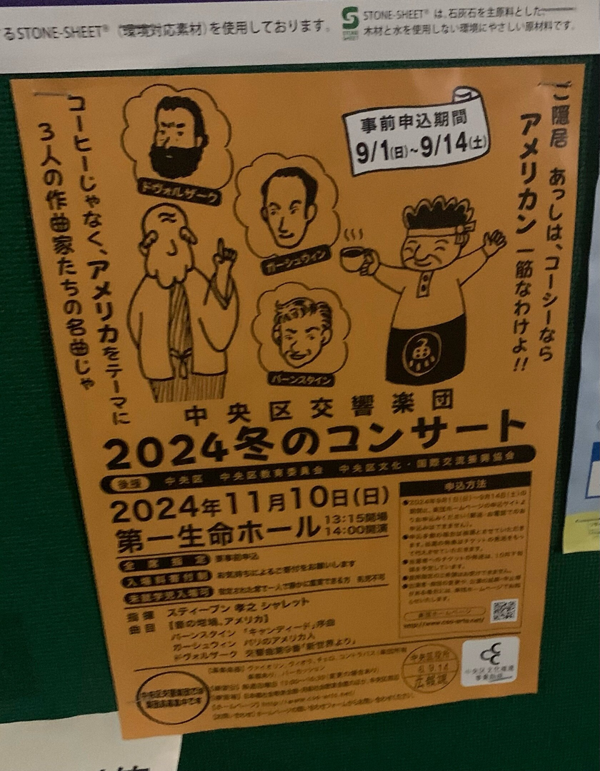 中央区交響楽団 2024冬のコンサートが開催されます。国際交流員協会が主催し、ドヴォルザーク、ガーシュウィン、バーンスタインの名曲が演奏されます。開場は13:15、開演は14:00です。全席指定で、入場料が必要です。事前申込期間は9月1日から9月14日までです。