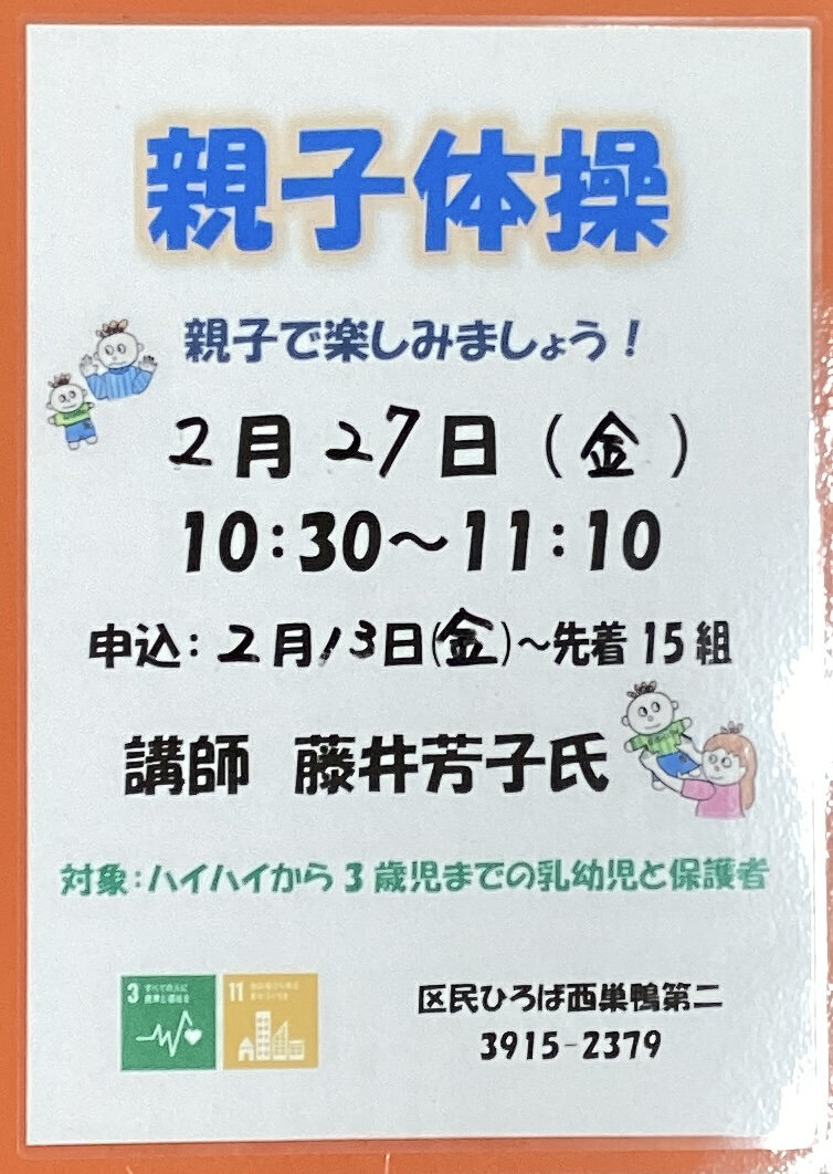 区民ひろば西巣鴨第二で『親子体操』を開催します。みんなで、楽しく体操をしましょう‼