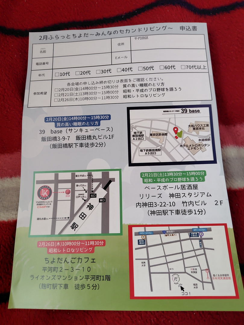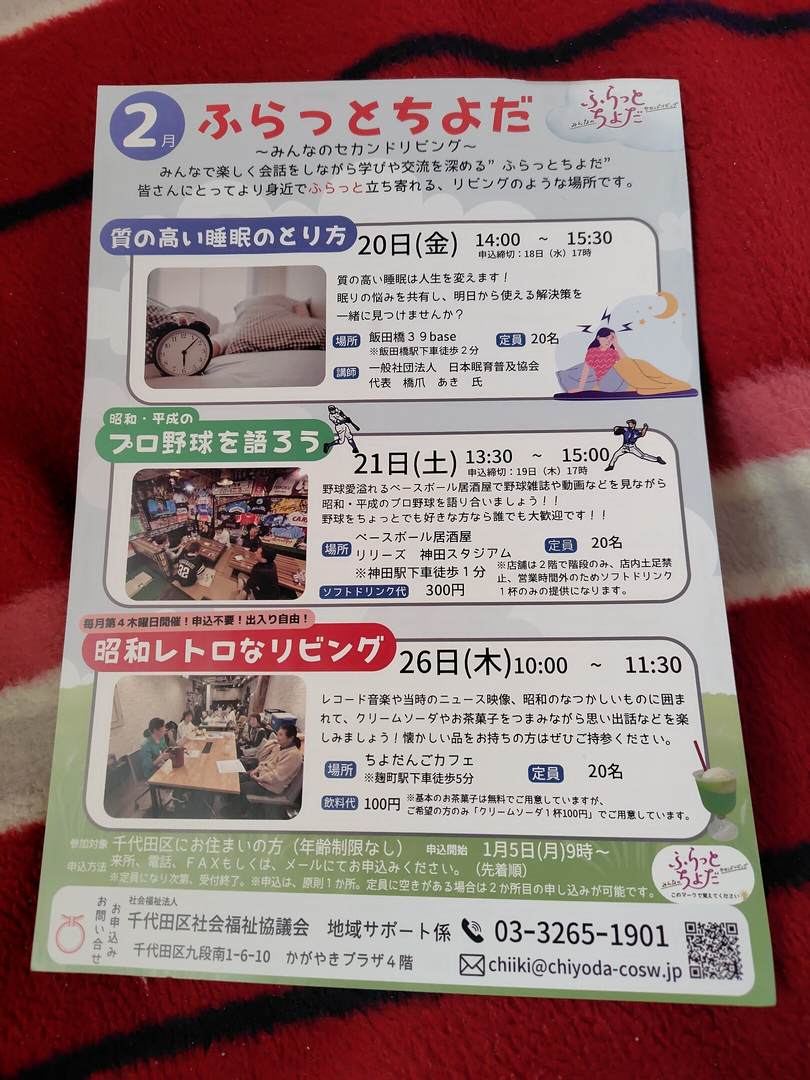 レコード音楽や当時のニュース映像、昭和の懐かしいものに囲まれて、クリームソーダや お茶菓子をつまみながら 思い出話などを楽しみましょう。ちよだんごカフェにて。参加対象は 千代田区にお住まいの方。定員は20名。飲料代 100円。