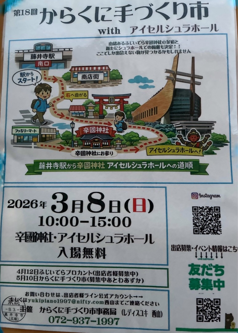 第18回 "からくに手づくり市 with アイセルシュラホール" 由緒あるふじいでら辛國神社の参道と藤井寺駅、新たにシュラホールでの開催も決定!! ここでしか出会えない物が見つかるかもしれません。駅から南口スタート! 商店街右へ曲がるファミリーマート辛国神社、辛国神社にお参り「アイセルシュラホールへ!! 藤井寺駅から辛国神社 アイセルシュラホールへの道順。