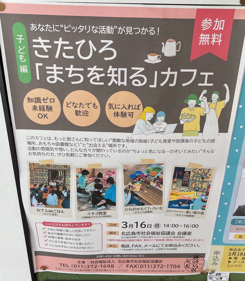 北広島市社会福祉協議会 会議室にて、きたひろ 「まちを知る」カフェ(こども編)が開催されます。北広島で行われている子ども食堂や放課後の子どもの居場所、おもちゃ図書館などの取り組みに興味がある方は、3月6日までに申し込みの上、参加してみてはいかがでしょうか。