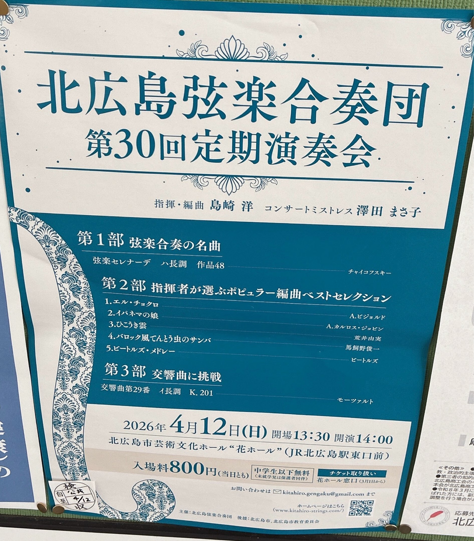 北広島市芸術文化ホールにて、「北広島弦楽合奏団第30回定期演奏会」が開催されます。入場料は800円で、中学生以下は無料です。弦楽器の演奏に興味がある方はぜひご参加ください。