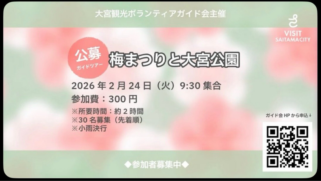 大宮公園駅~大宮公園(百年の森、遊園地ホテル跡、大正天皇の皇后行啓碑など散策)~大宮第二公園(梅まつり、陶器市など)~現地解散(予定)(約2.5Km)