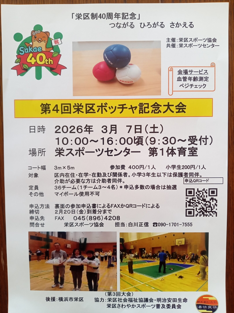 今年で4回目を数えます大会で栄区制40周年イヤーなので記念大会としての開催です。募集中です。見学歓迎。健康チェックもやってます。