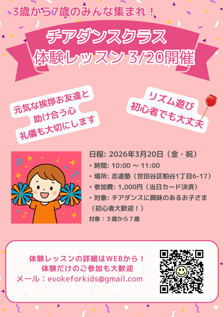 3歳から7歳のみんな集まれ! チアダンスクラス 体験レッスン3/20開催 元気な挨拶お友達と 助け合う心 礼儀も大切にします 初心者でも大丈夫 リズム遊び