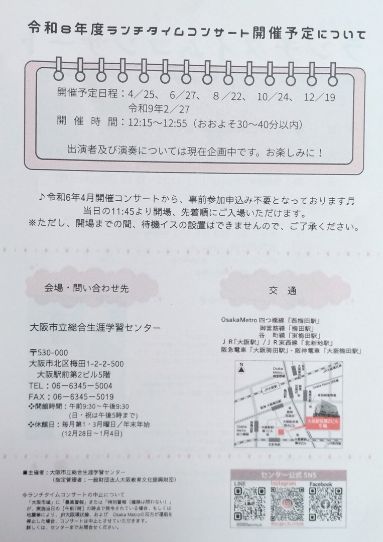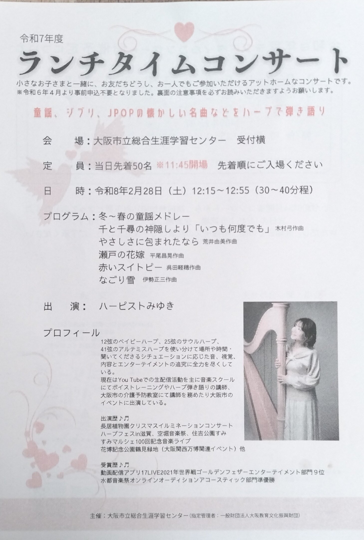 大阪市立総合生涯学習センター受付横にて、気軽に楽しめるランチタイムコンサートが開催されます。予約不要で、小さなお子さまと一緒に、お友だちどうし、お一人でもご参加いただけるアットホームなコンサートです。童謡、ジブリ、JPOPの懐かしい名曲などをハープで弾き語りします。