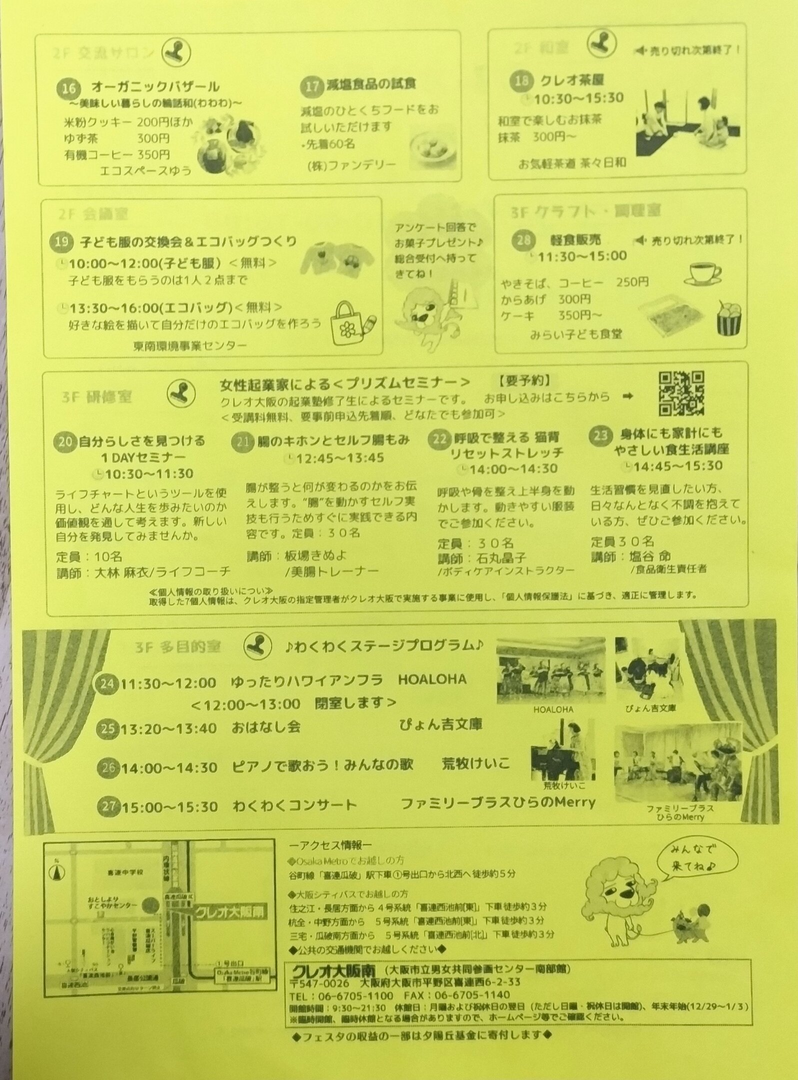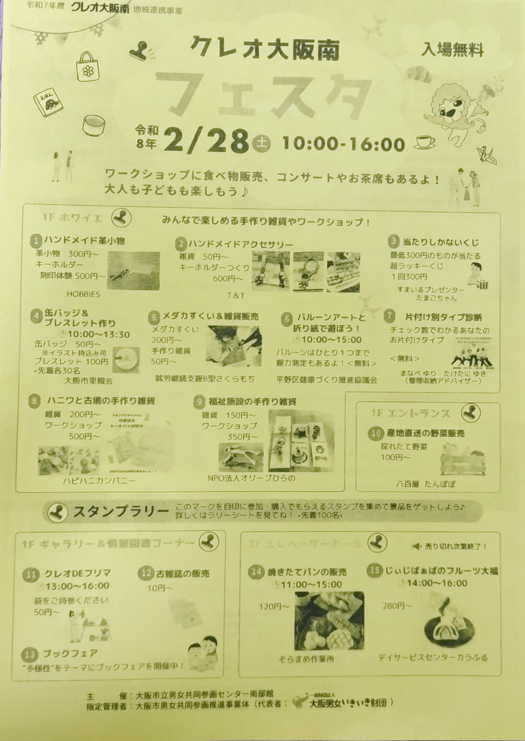 クレオ大阪南フェスタは、大阪メトロ谷町線の喜連瓜破駅から徒歩5分の場所で開催されます。入場無料で、お子さまとのおでかけにも最適です。