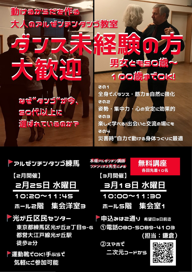 練馬区光が丘で、50歳から100歳まで楽しめる「健康アルゼンチンタンゴ」の無料体験講座を開催します!