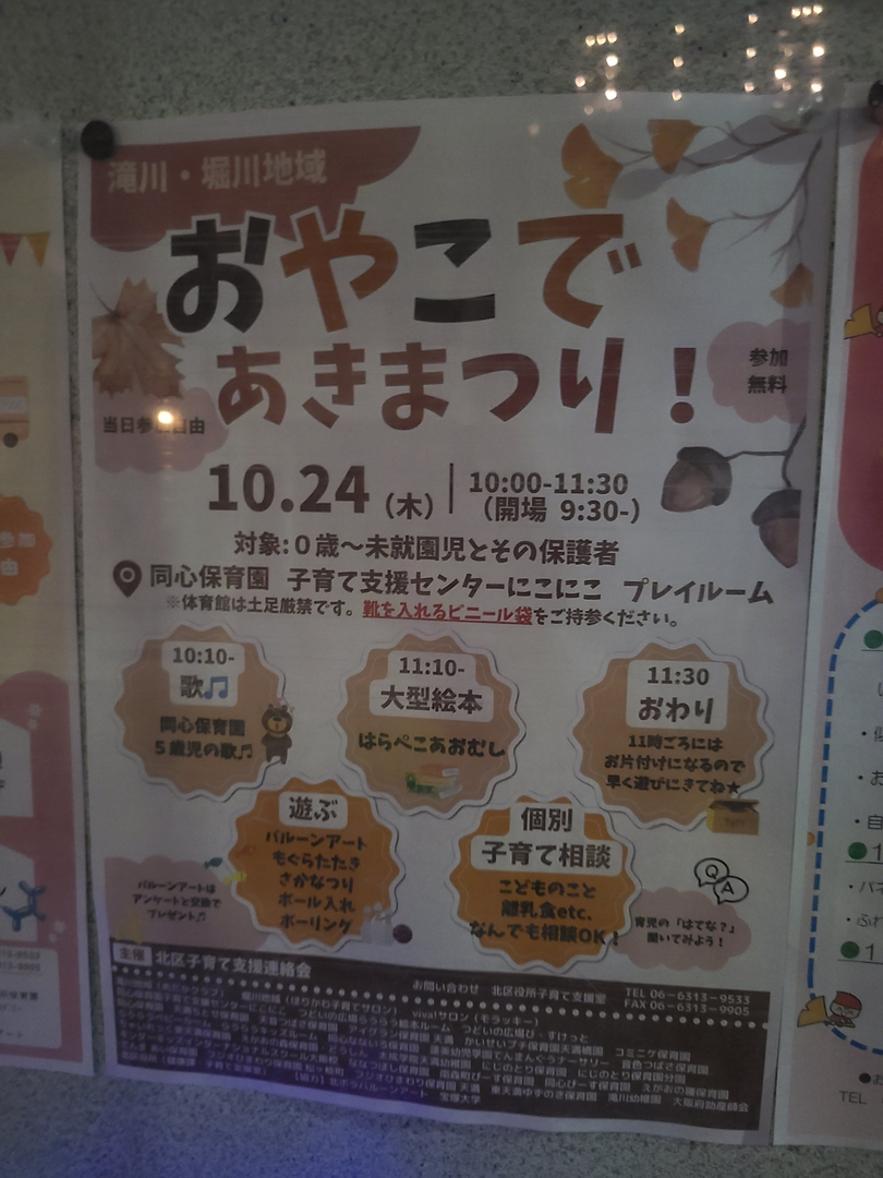 0~未就園児とその保護者を対象にした子育て支援イベントです。同心保育園というところで歌や大型絵本のイベントやちょっとしたゲームもあるようです。また親にとってはとても助かる子育て相談会も実施されているそうなので、縦横のつながりができてとても参加したいイベントですね。
