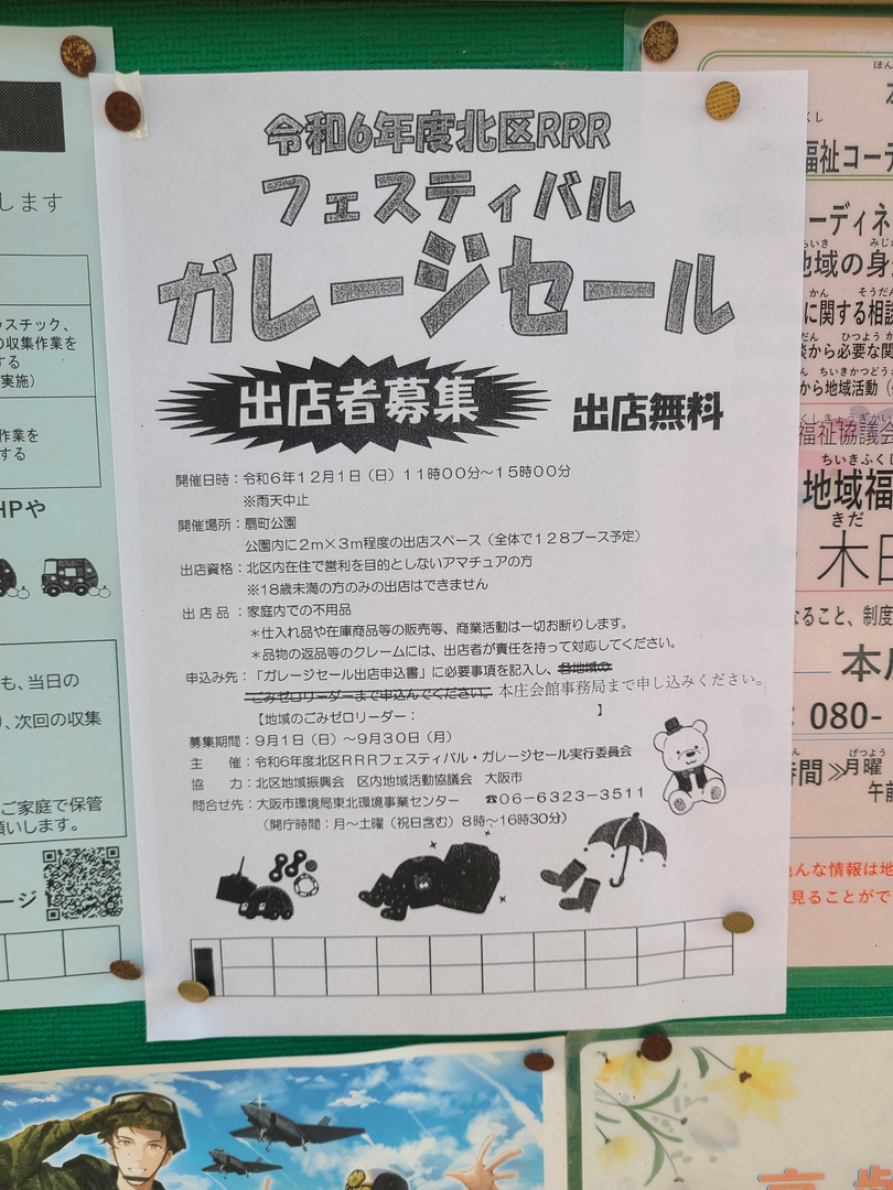 毎年開催されているように思えますが、扇町公園で開催されるガレージフェスティバルです。バザーみたいなもので家庭の不用品が出品されるとのこと。SDGsの世の中なのでもっとこんなイベントが開催されたらいいなと思います。子供服なんかもあればとてもいいですね。
