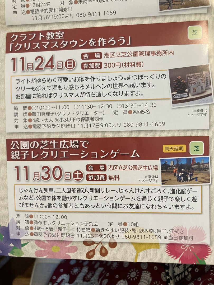 ライトがゆらめく可愛いお家を作りましょう。まつぼっくりのツリーも添えて温もり感じるメルヘンの世界へ誘います。お部屋に飾ればクリスマスが待ち遠しくなりますよ。定員は各回5名で、対象は4歳から大人まで(小3以下は保護者同伴)。
