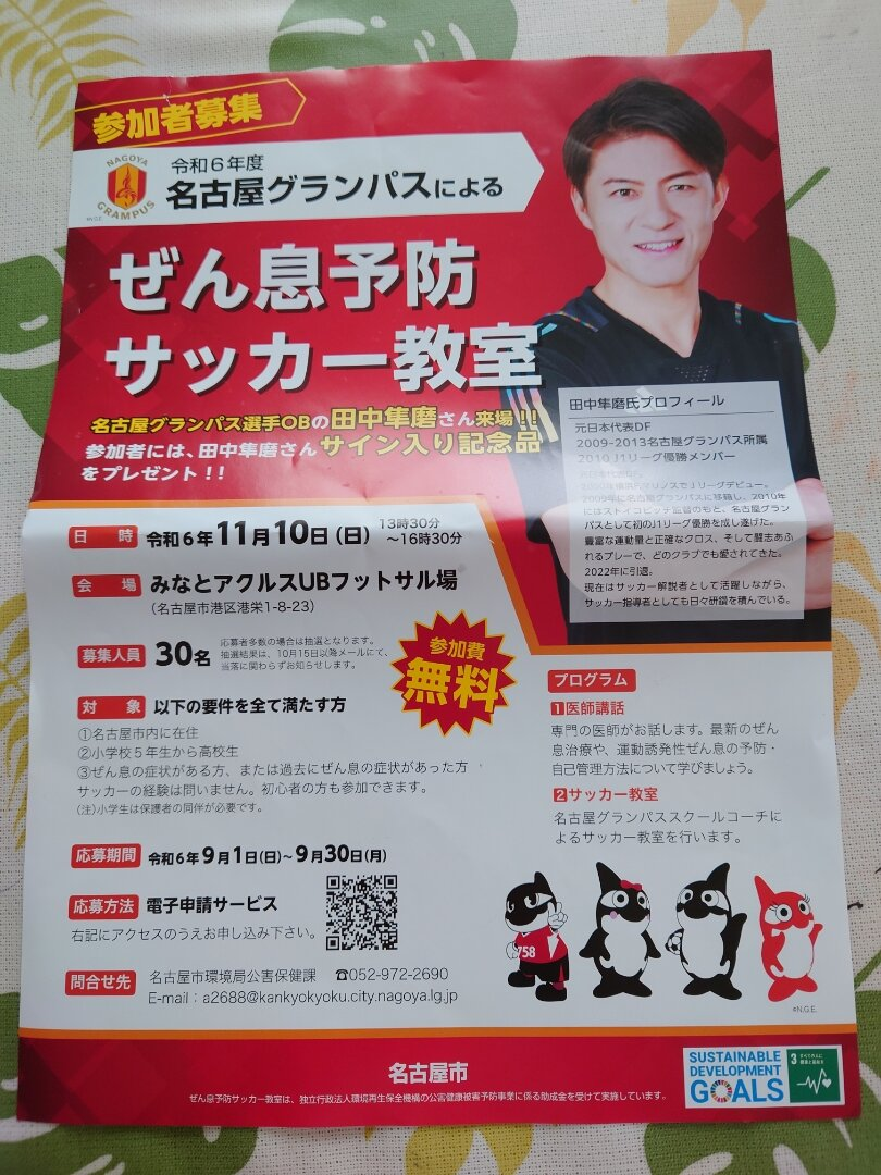 名古屋グランパスによる市内在住のぜん息症状や過去にぜん息があった小学校5年生から高校生を対象としたサッカー教室が開催されます。参加費も無料です。名古屋グランパス選手OBの田中隼磨さんが来場し、参加者には田中隼磨さんサイン入り記念品をプレゼントします。医師講話では、専門の医師が最新のぜん息治療や運動誘発性ぜん息の予防・自己管理方法についてお話します。サッカー教室は名古屋グランパススクールコーチによる指導です。応募期間は令和6年9月1日から9月30日までで、電子申請サービスを通じて応募できます。抽選結果は10月15日以降にメールで通知されます。