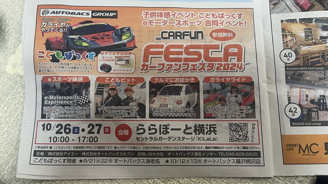 eスポーツ体感、e-Motorsports Experience、eモータースポーツ合同イベント、CARFUN 参加無料、FESCA、ガーファンフェスタ2024、40席、みなとみらいBASE、Club Lounge、缶バッジプレゼント、こどもピット、クルマにお絵かき、ガライヤライド、リアルなハンドル ドライビングシートを使用しながら「グランツーリスモ」のタイムアタックイベントを開催、オートバックスのツナギを着てピットマンと一緒にタイヤ交換体験、普段は出来ないクルマにラクガキできちゃいます、本物のGTマシン「ガライヤ」に乗るチャンス、キッズ用レーシングスーツを着て記念撮影。