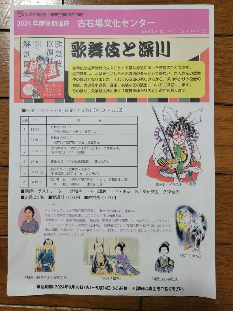 歌舞伎は江戸時代の人々にとって最も身近にあった芸能のひとつです。江戸深川は、水路を生かした材木流通の要所として賑わい、たくさんの歌舞伎の舞台となりました。それらの演目の楽しみ方から、深川ゆかりの役者のお話、大道具小道具、音楽、衣装などの演出についても深堀りします。そのほか、久染健夫氏と歩く「歌舞伎ゆかりの地」の回もあります。講座は全6回で、日程は11/17、12/8、1/19、2/16、2/23、3/16の各日曜、時間は14:00~15:30です。