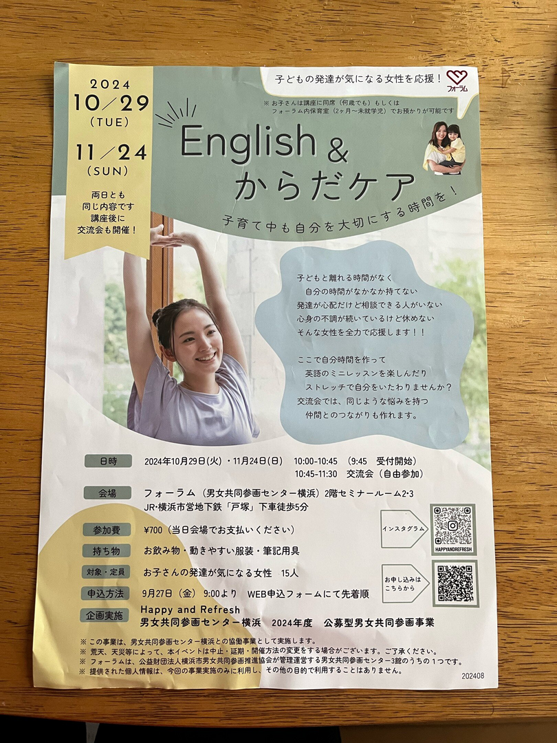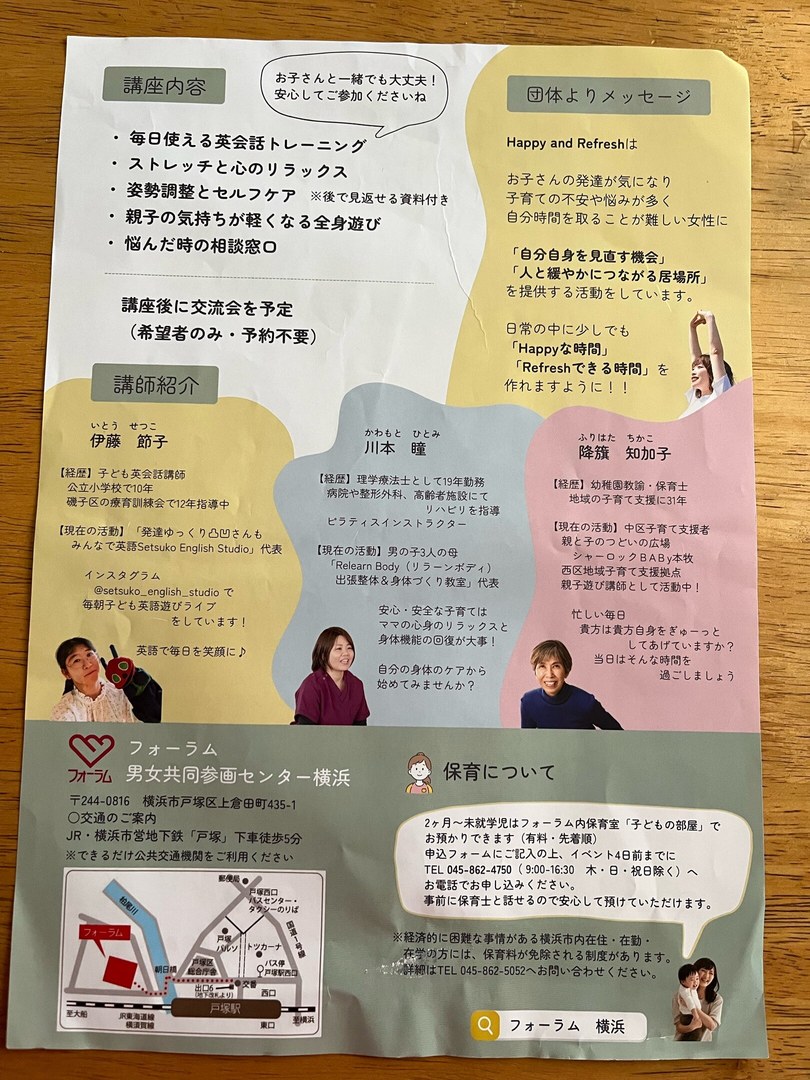 毎日使える英会話トレーニング・ストレッチと心のリラックス・姿勢調整とセルフケア 後で見返せる資料付き・親子の気持ちが軽くなる全身遊び・悩んだ時の相談窓口