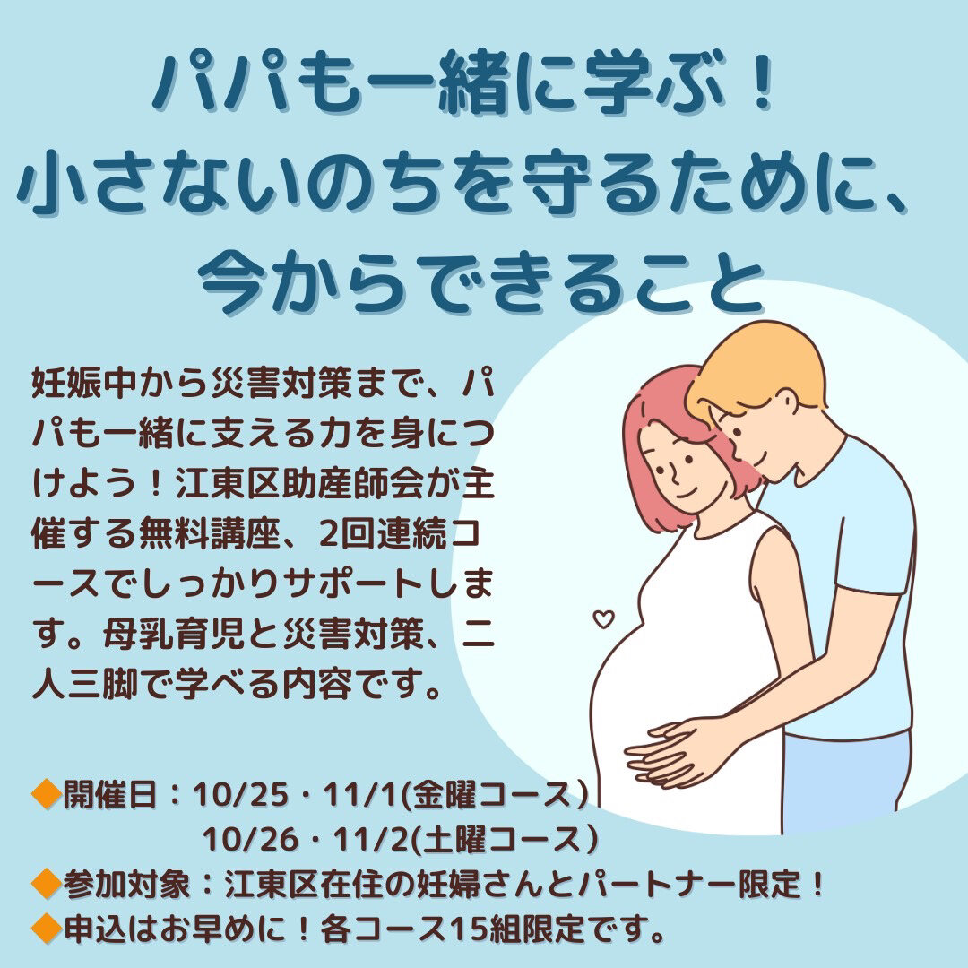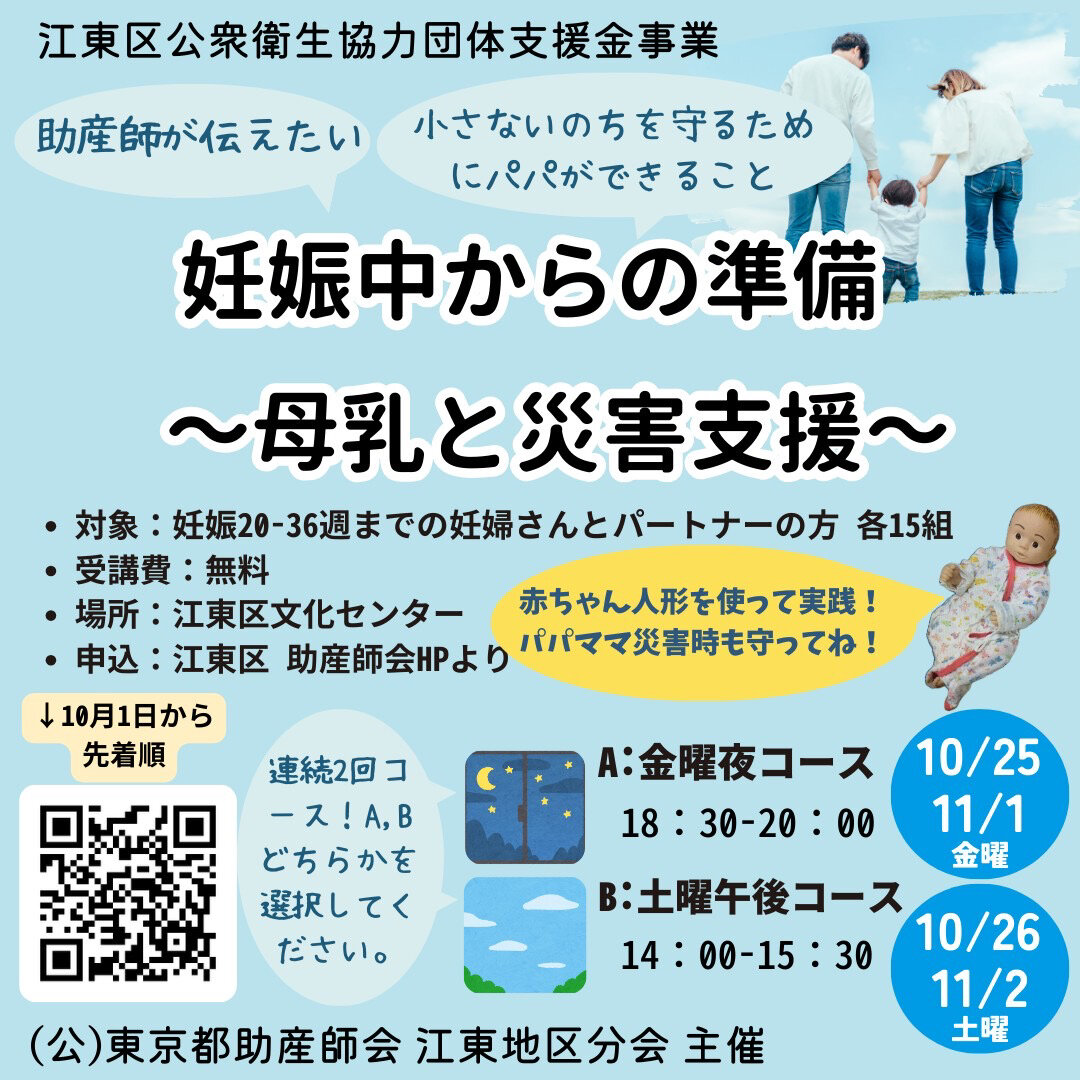 江東区の助産師会が主催する無料講座、2回連続コースでしっかりサポートします。母乳育児と災害対策、二人三脚で学べる内容です。