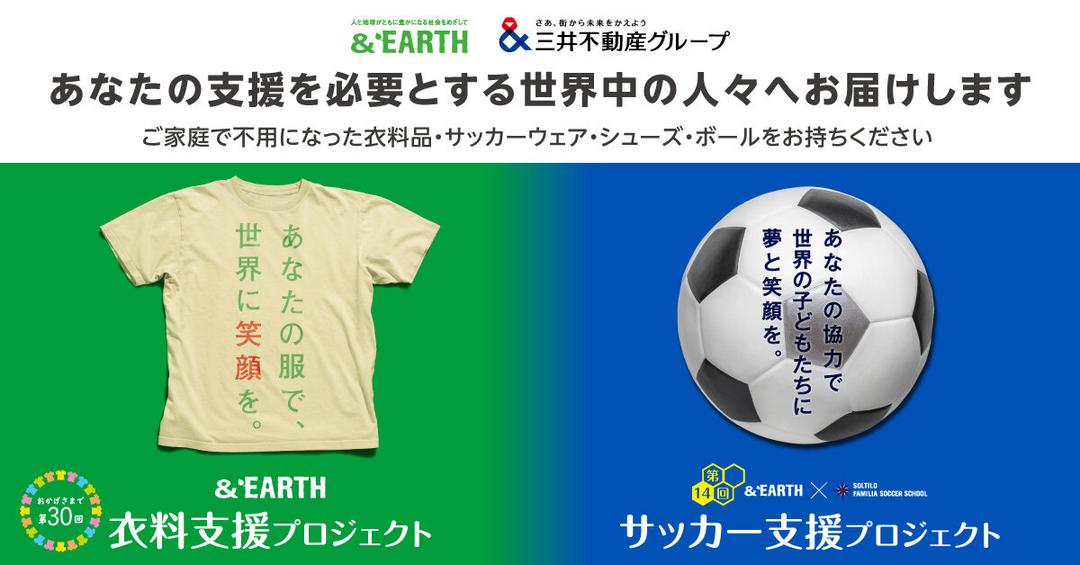 ご不用になった衣料品を世界各地の難民、避難民、被災地の人々へ寄贈する活動「&EARTH衣料支援プロジェクト」と、使わなくなったサッカー用具を寄贈する「サッカー支援プロジェクト」を開催いたします。また、会場では海外輸送費の一部をご負担いただくための募金もおこないます。ご家庭で眠っている衣料品やサッカー用具などをぜひお持ちください!