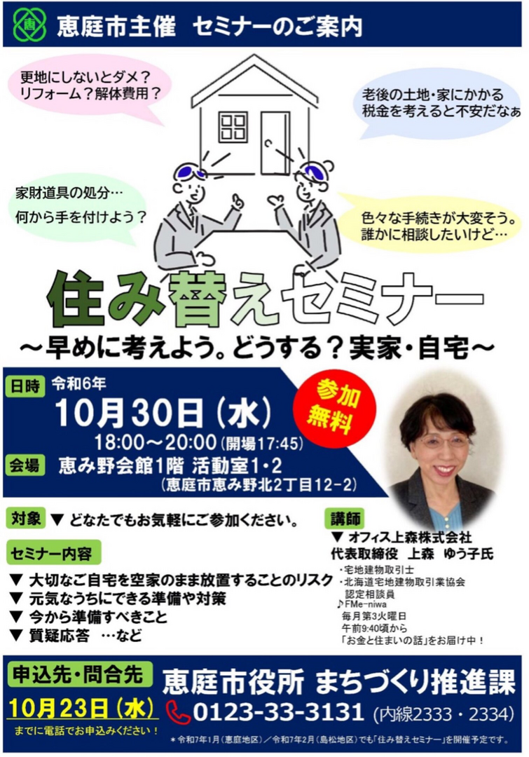 恵庭市* 住み替えセミナー「早めに考えよう。どうする?実家・自宅」を開催します!