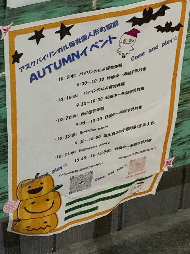 アスクバイリンガル保育園 人形町駅前で、妊娠中から未就学児を対象としたHalloween partyが開催されます。東京メトロ日比谷線・都営浅草線人形町駅から徒歩2分のビルの2階にある認証保育園です。2024年4月よりバイリンガル保育園に変わり、「イマ―ジョン教育」の考えをベースに、母国語としての日本語を大切にしつつ英語環境の中で保育活動を行っています。アットホームで元気いっぱい、笑顔いっぱいの園です。