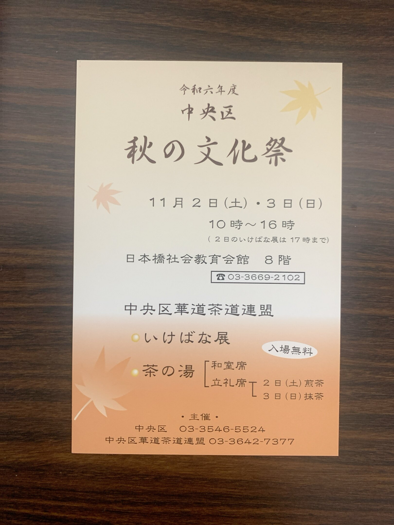今和六年度中央区秋の文化祭が11月2日(土)と3日(日)に開催されます。時間は10時から16時まで(2日のいけばな展は17時まで)。場所は日本橋社会教育会館8階です。いけばな展は入場無料で、茶の湯は和室席と立礼席があります。2日(土)は煎茶、3日(日)は抹茶が提供されます。