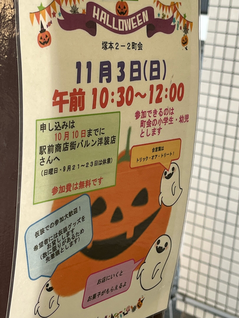 ハロウィンイベントが11月3日(日)に開催されます。参加できるのは町会の小学生と幼児です。仮装での参加大歓迎で、希望者には仮装グッズをお貸しします(数に限りがあるため先着順とします)。お店に行くとお菓子がもらえます。参加費は無料です。合言葉は「トリック・オア・トリート!」です。