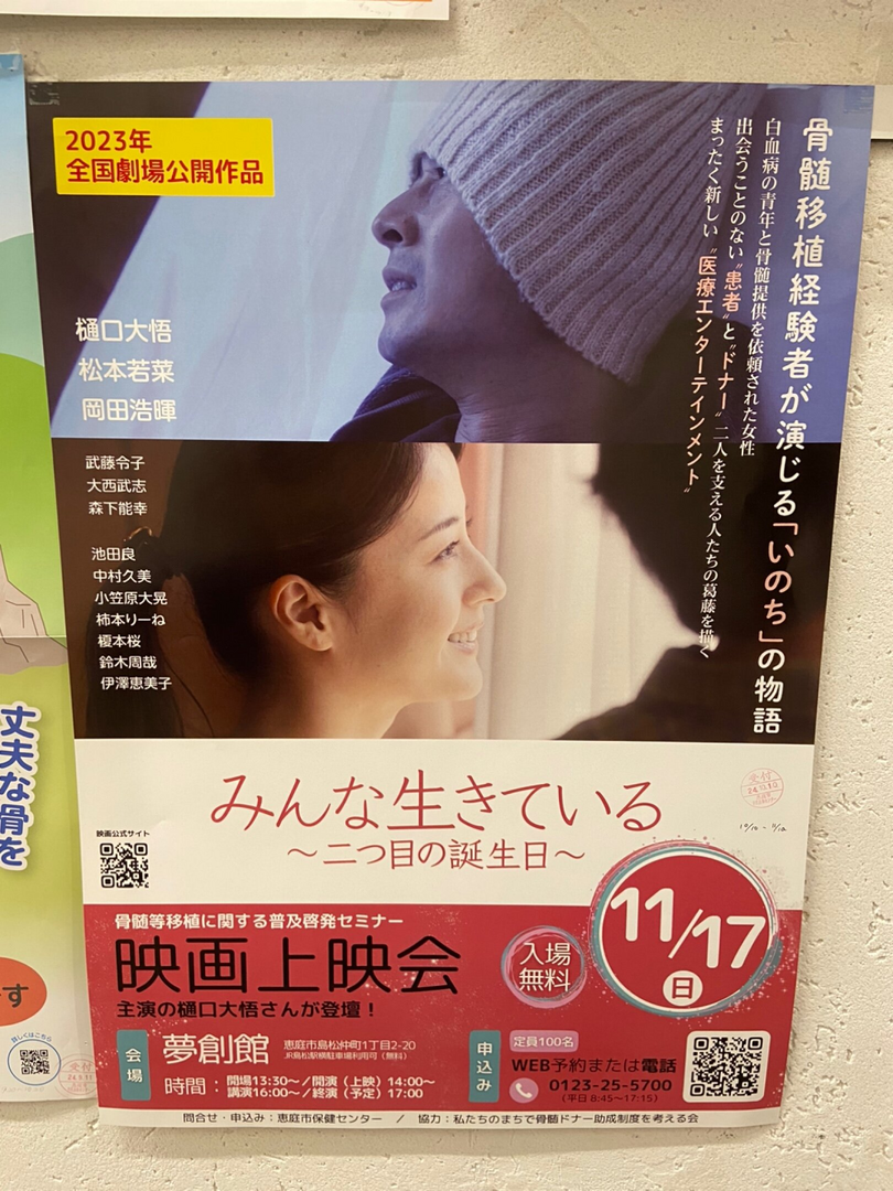 恵庭市で開催される骨髄等移植に関する普及啓発セミナー映画上映会「みんな生きている ~二つ目の誕生日~」。骨髄移植経験者が演じる「いのち」の物語で、白血病の青年と骨髄提供を依頼された女性、出会うことのない患者とドナーを支える人たちの葛藤を描く新しい医療エンターテインメントです。主演の樋口大悟さんが登壇します。入場は無料で、定員は100名です。WEB予約または電話での申込みが必要です。