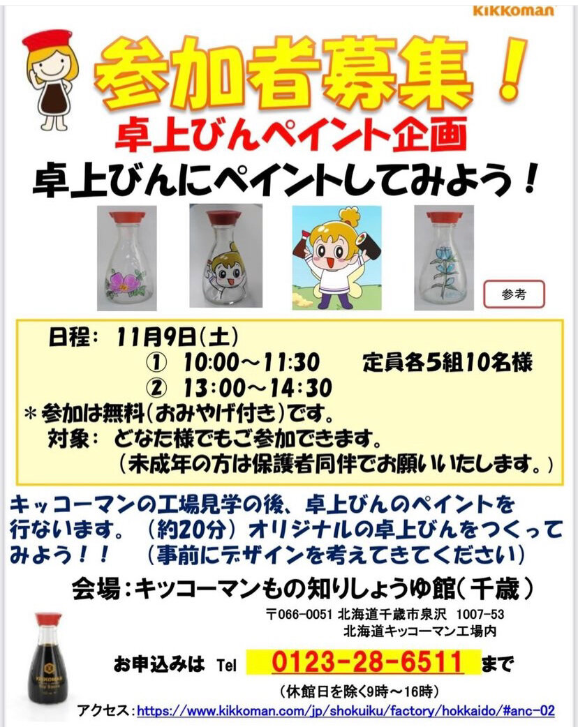 千歳市にある「キッコーマンもの知りしょうゆ館」(北海道キッコーマン工場内)にて、楽しいイベントを開催します。工場見学で、実際に見て、触れて、しょうゆの製造工程を体感した後は"オリジナルのキッコーマン卓上びん"をデザインしてみませんか?世界に一つだけ、自分だけの卓上びんをつくる絶好のチャンスです!