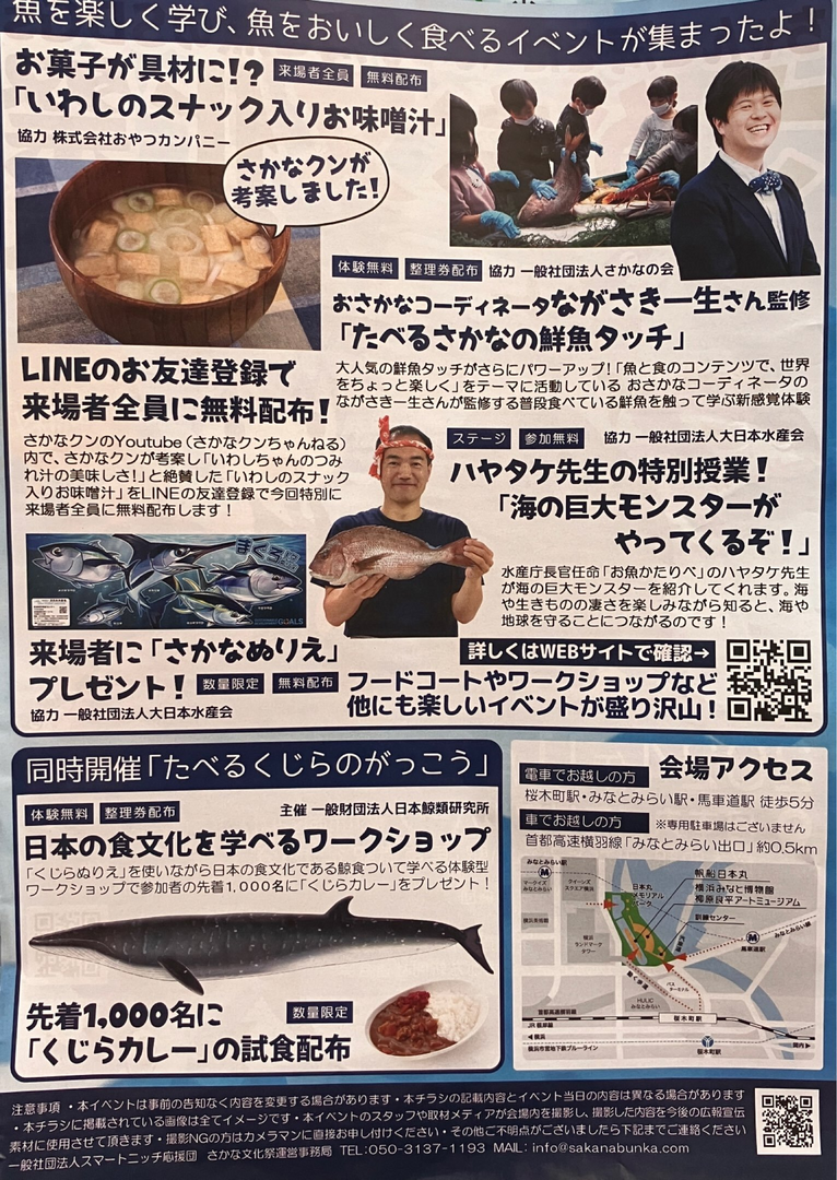 ちゃんと海をたべよう。海と魚のSDGSをテーマにした「さかな文化祭2024」が開催されます。入場無料で、魚を楽しく学び、おいしく食べるイベントが盛りだくさんです。さかなクン考案の「いわしのスナック入りお味噌汁」や、ながさき一生さん監修の「たべるさかなの鮮魚タッチ」など、体験無料のイベントが用意されています。また、ハヤタケ先生による特別授業「海の巨大モンスターがやってくるぞ!」も開催されます。その他、フードコートやワークショップなど、楽しいイベントが盛りだくさんです。同時開催の「たべるくじらのがっこう」では、先着1,000名に「くじらカレー」をプレゼントします。