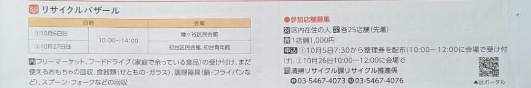 リサイクルバザールが開催されます。フリーマーケット、フードドライブ(家庭で余っている食品)の受け付け、まだ使えるおもちゃの回収、食器類(せともの・ガラス)、調理器具(鍋・フライパンなど)、スプーン・フォークなどの回収を行います。区内在住の方を対象に参加店舗を募集しています。1店舗1,000円で、先着25店舗です。申込は10月26日10:00~12:00に会場にて行います。