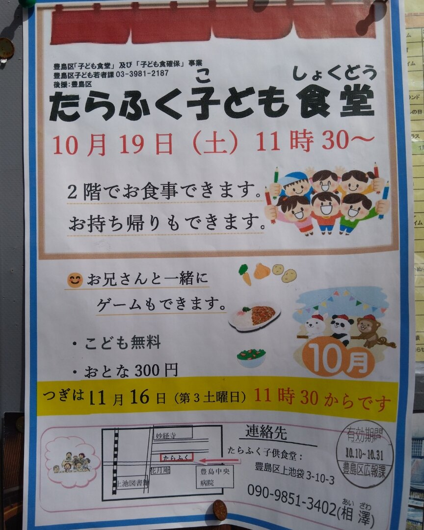 上池袋3丁目にある子供食堂です。こども無料、大人300円。事前予約なしで利用できます。豊島区「子ども食堂」及び「子ども食確保」事業。後援: 豊島区。2階でお食事できます。お持ち帰りもできます。ゲームもできます。