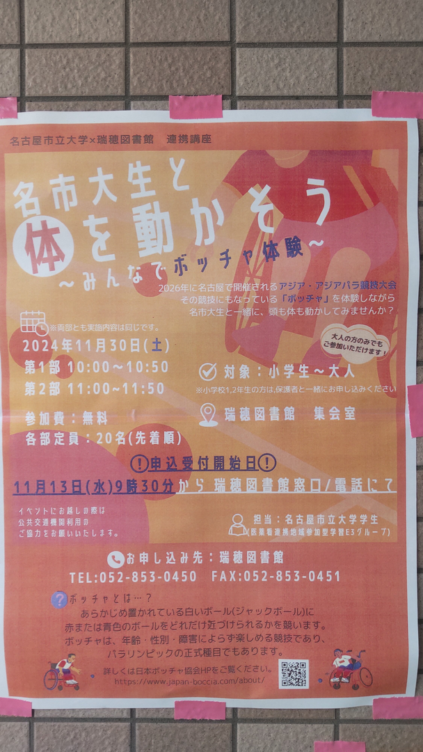 瑞穂区の瑞穂図書館 集会室にて開催のイベントです。対象は小学生~大人、各部定員20名、無料。(大人の方のみでも参加OKです)2026年に名古屋で開催されるアジア・アジアパラ競技大会の競技にもなっている「ボッチャ」を体験しながら、名市大生と一緒に、頭も体も動かしてみませんか? 第1部 10:00~10:50 第2部 11:00~11:50 小学校1,2年生の方は、保護者と一緒にお申し込みください。イベントにお越しの際は公共交通機関利用のご協力をお願いいたします。