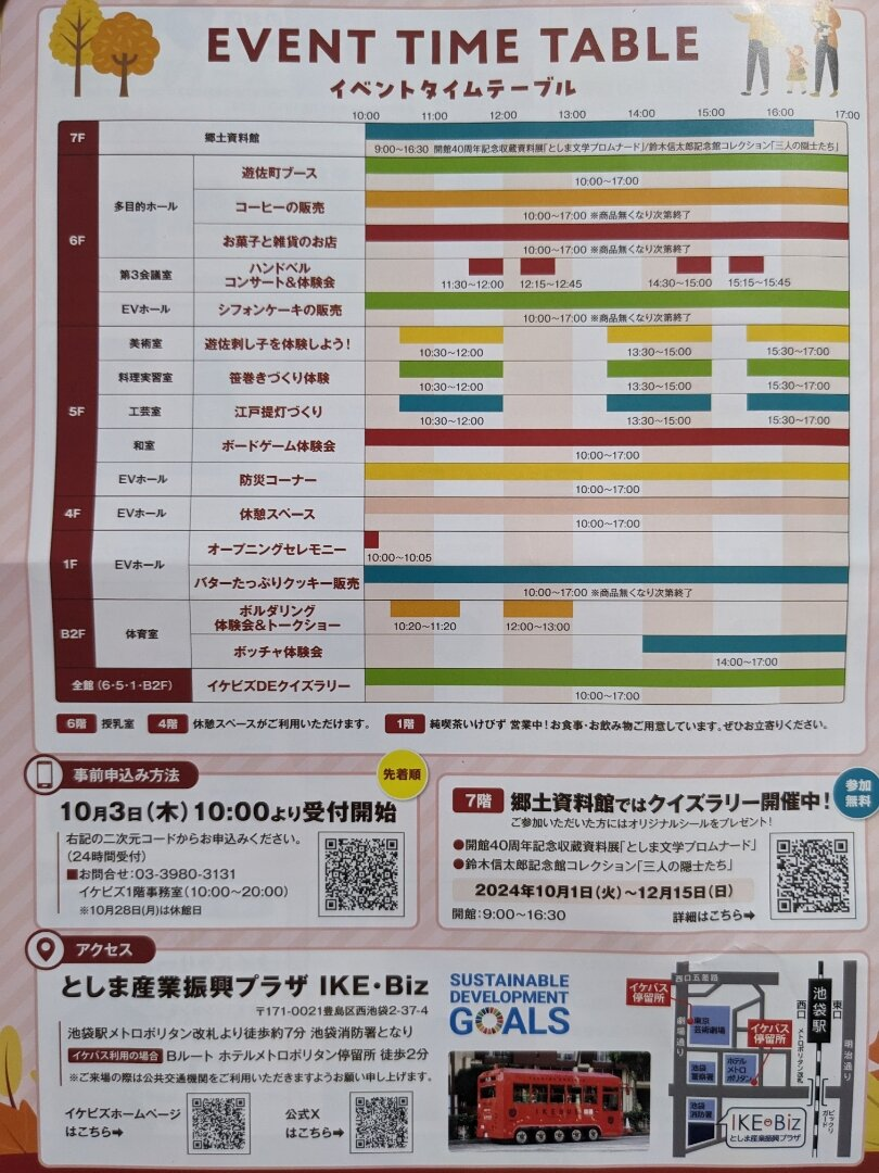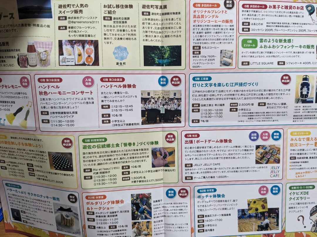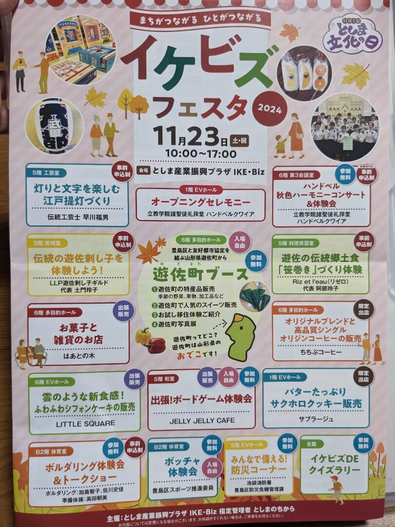 イケビズフェスタでは、様々な体験ができるイベントが開催されます。事前申込みが必要な「笹巻きづくり」や「刺し子体験」「江戸提灯づくり」などがあります。オープニングセレモニーやハンドベルコンサート、ボードゲーム体験会、防災コーナーなど、多彩なプログラムが用意されています。参加は無料で、事前申込みが必要なプログラムもあります。