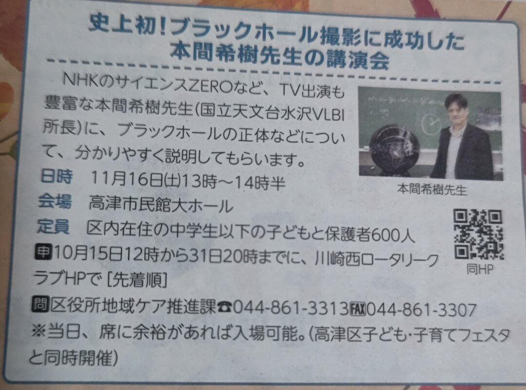 NHKのサイエンスZEROなどTV出演も豊富な、史上初のブラックホール撮影に成功した国立天文台水沢VLBI所長の本間希樹先生が、ブラックホールの正体について分かりやすく説明する講演会が開催されます。定員は区内在住の中学生以下の子どもと保護者600人で、10月15日12時から31日20時までに川崎西ロータリークラブHPで先着順で申し込み可能です。当日、席に余裕があれば入場可能です。高津区子ども・子育てフェスタと同時開催。