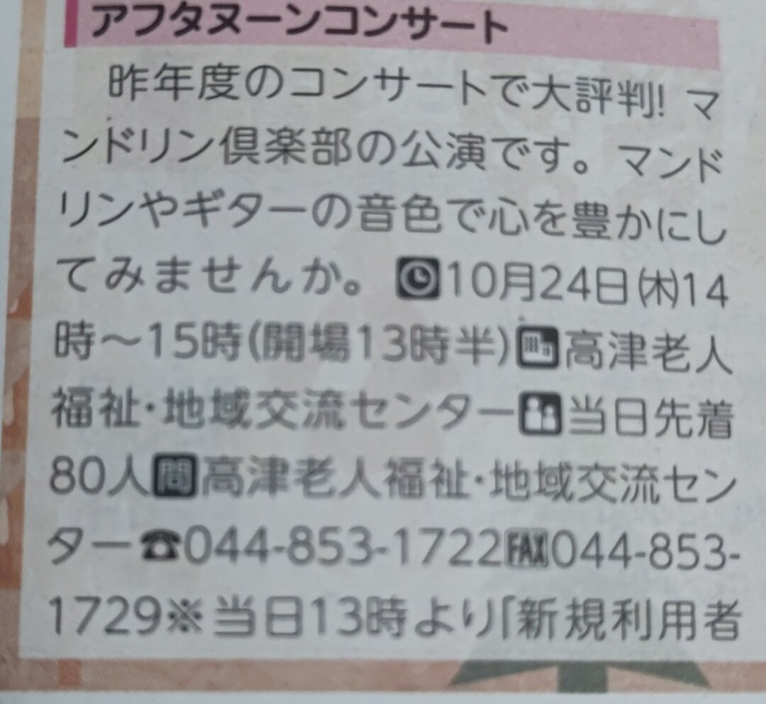 10月24日 (木) 14時~15時 (開場 13時半) 高津老人福祉・地域交流センター当日先着80人