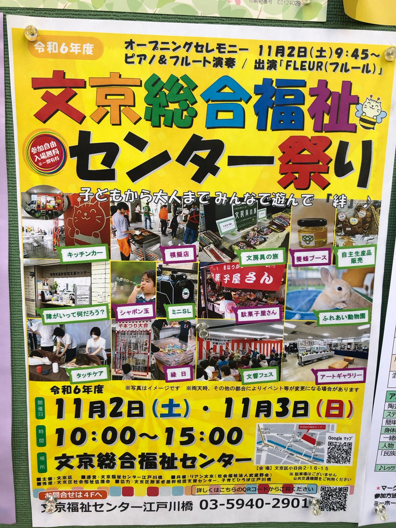 文京総合福祉センターで開催される祭りです。子どもから大人まで楽しめるイベントで、ふれあい動物園やキッチンカー、模擬店、文房具の旅、蜂ブース、駄菓子屋さん、シャボン玉、ミニSL、千本つり大などがあります。オープニングセレモニーは11月2日(土)9:45からで、ピアノ&フルート演奏が行われます。参加は自由で入場無料ですが、一部有料のものもあります。雨天時やその他の都合によりイベントが変更になる場合があります。