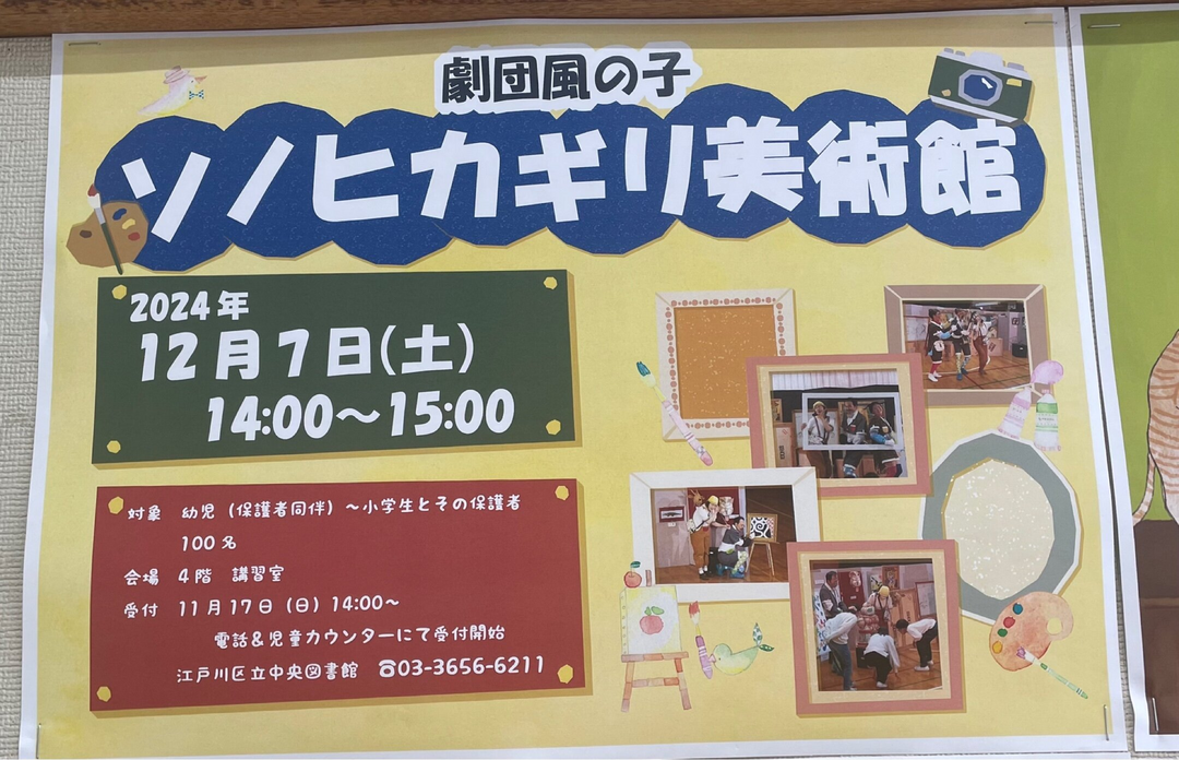 劇団風の子による「ソノヒカギリ美術館」が開催されます。対象は幼児(保護者同伴)、小学生とその保護者です。受付は11月17日(日)14:00から電話または児童カウンターで開始されます。