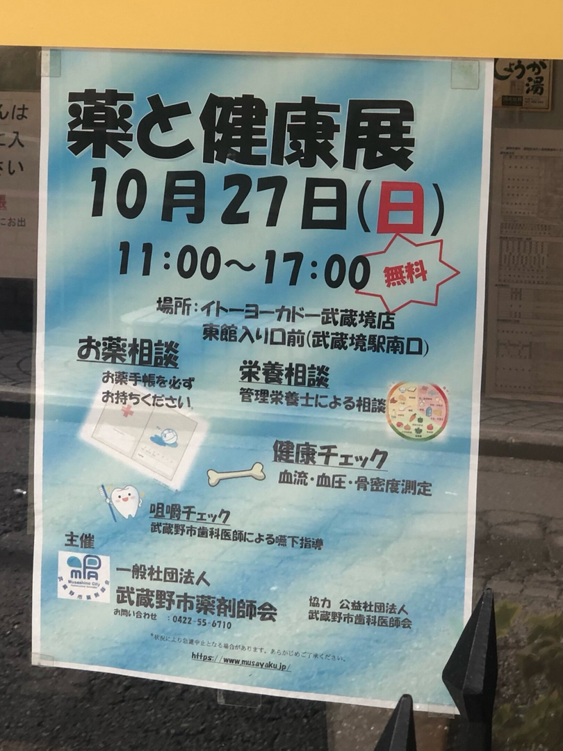 薬と健康展が10月27日(日)に開催されます。参加費は無料です。場所はイトーヨーカドー武蔵境店の東館入り口前です。お薬相談ではお薬手帳を必ずお持ちください。栄養相談は管理栄養士による相談が行われます。健康チェックでは血流・血圧・骨密度測定が行われ、咀嚼チェックでは武蔵野市歯科医師による嚥下指導があります。主催は武蔵野市薬剤師会です。状況により中止となる場合がありますので、あらかじめご了承ください。