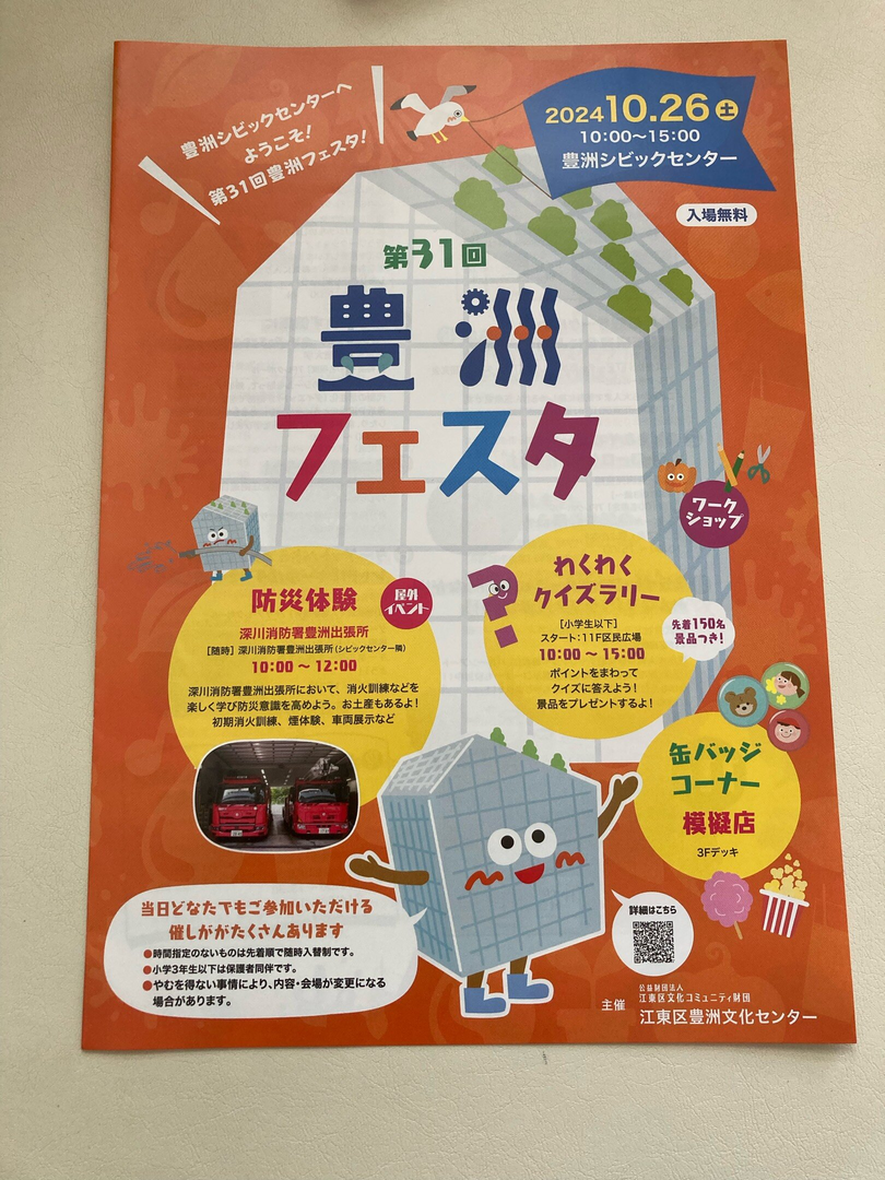 防災体験@深川消防署豊洲出張所、ワクワククイズラリー、缶バッジコーナー、模擬店などたくさんのイベントが開催されるそうです。🧑🚒