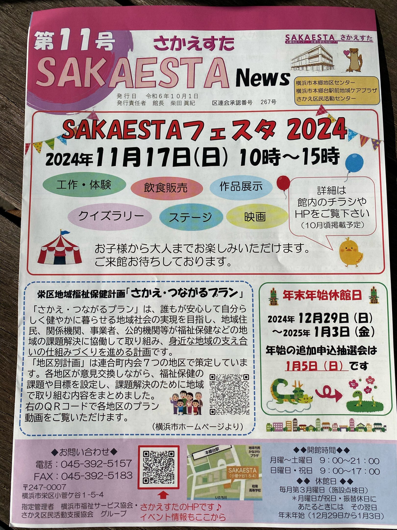SAKAESTAフェスタ 2024は、2024年11月17日(日)10時から15時まで開催されます。工作体験、飲食販売、作品展示、クイズラリーやステージ発表、映画など、お子様から大人まで楽しめる企画がたくさん用意されています。詳細は館内のチラシやHPをご覧ください。