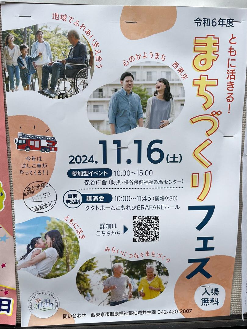 令和6年度 ともに生きる!まちづくりフェスが2024年11月16日(土)に開催されます。参加型イベントは10:00から15:00まで行われ、保谷庁舎(防災・保谷保健福祉総合センター)で開催されます。講演会は事前申し込み制で、10:00から11:45までタクトホームこもれびGRAFAREホールで行われます。お子さま向けプレイランドやキッズ工作、コリントなどの広場、ちょこっと相談コーナー(児童発達支援センターひいらぎ)もあります。はしご車もやってきます。