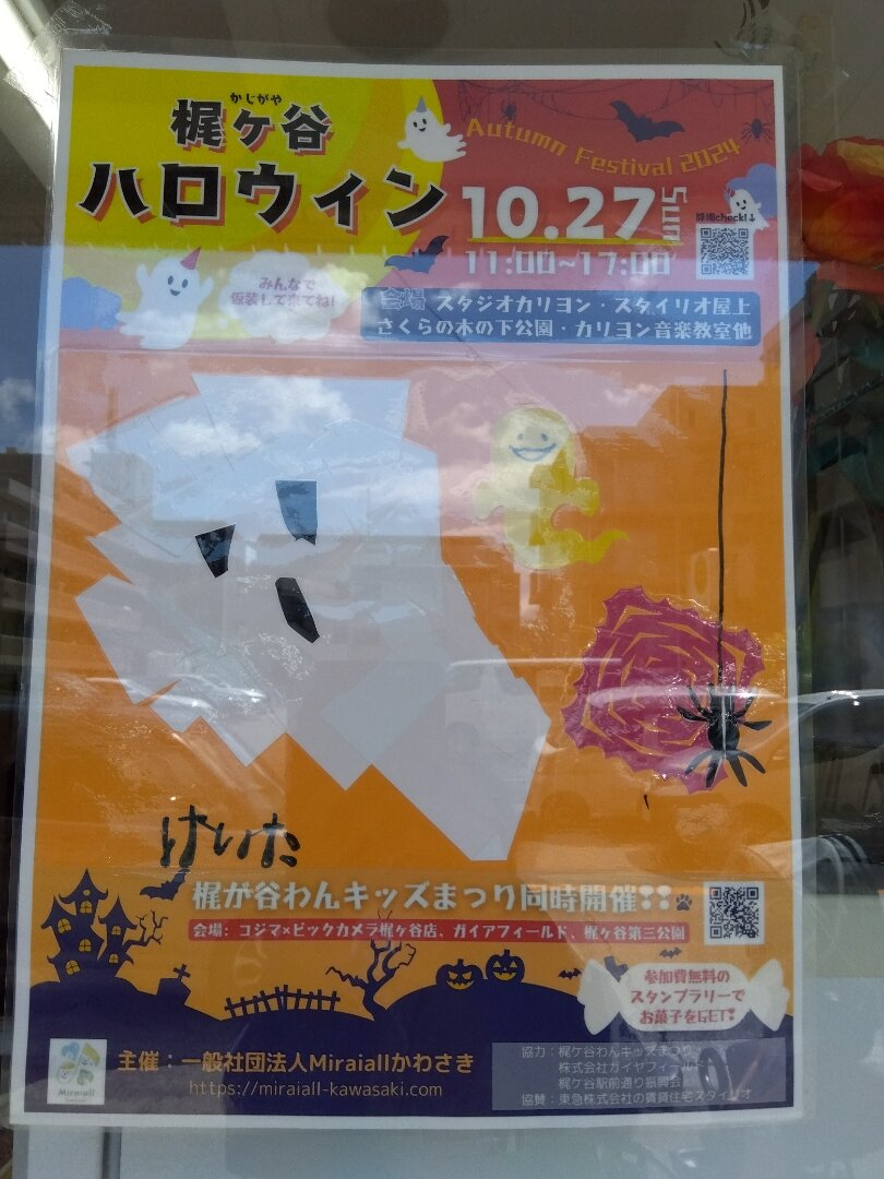 梶が谷駅のカリヨン周辺とスタイリオ屋上とさくらの木の下公園でハロウィンイベントがあります。ヨガ、絵本コンサート、ダンス、ワークショップ、飲食物販売、駄菓子販売があります。仮装してスタンプラリーに参加するとお菓子がもらえます。梶が谷わんキッズ祭りもコジマ、梶谷第三公園で同時開催されます。こちらでも色々なワークショップがあります。