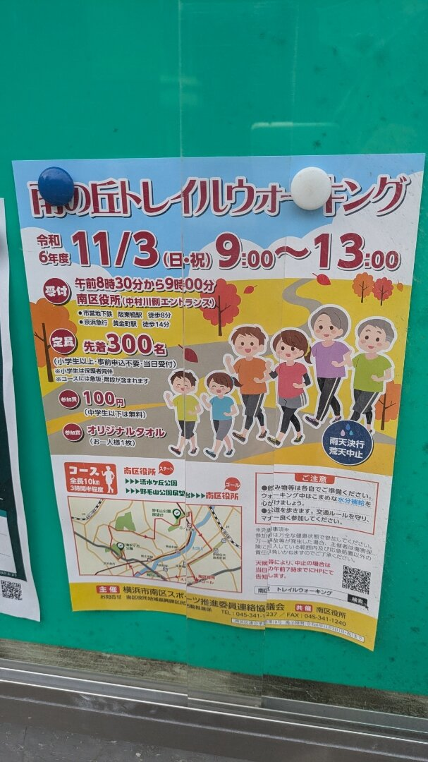 南の丘トレイルウォーキングは、10kmウォーキングするイベントです。小学生以上なら親子で参加でき、事前申込不要で当日受付です。参加費は100円で、中学生以下は無料です。オリジナルタオルが特典として配布されます。雨天決行、荒天中止です。コースには急坂階段が含まれますのでご注意ください。飲み物等は各自でご準備ください。公道を歩きますので、マナー良く参加しましょう。天候等により中止の場合は、当日の午前7時までにHPにて告知します。