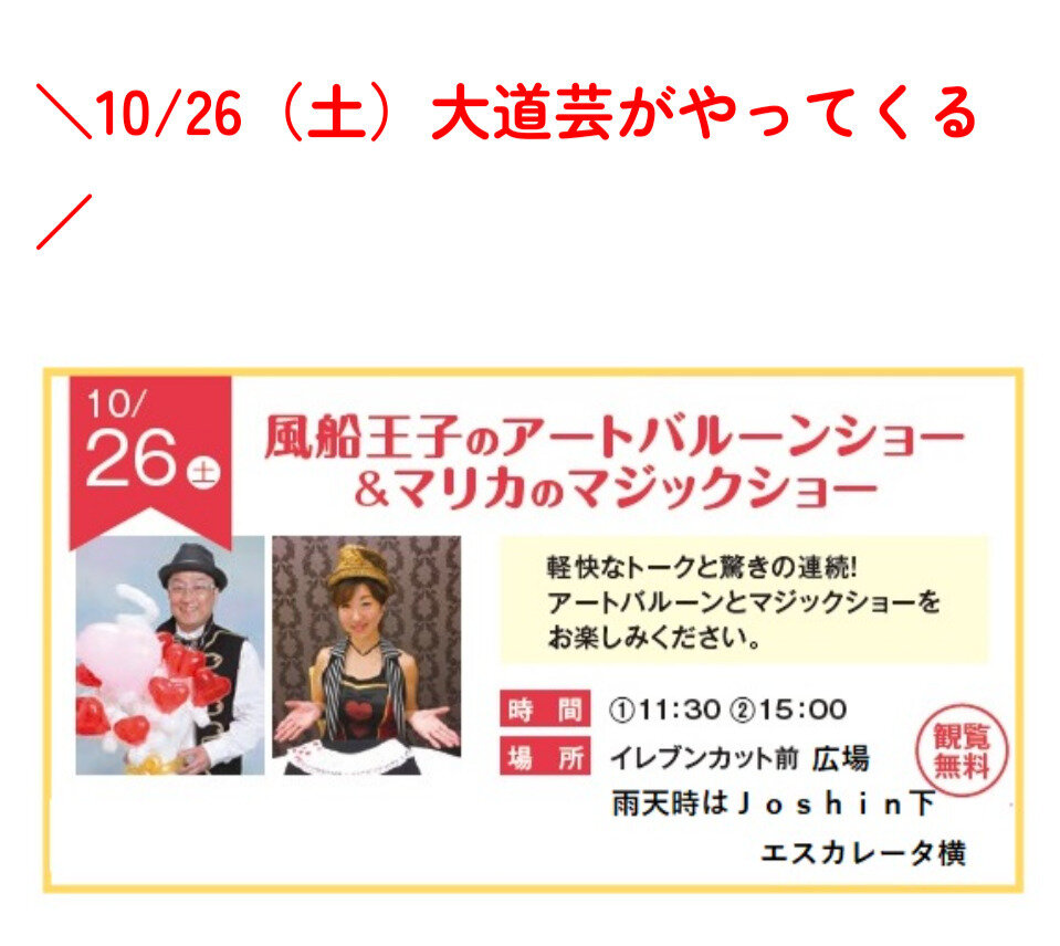 イオンタウン富雄はオープンから10周年を迎え、10/19-11/3の間の土日に様々なイベントを開催しています。今週末はアートバルーンショー、マジックショー、段ボール迷路、段ボール工作教室が開催されます。お買い物ついでにぜひお立ち寄りください。