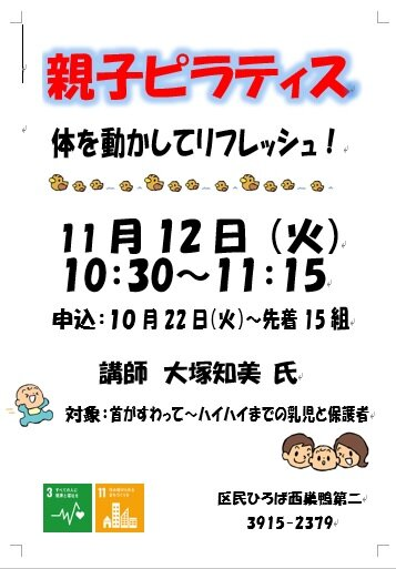 区民ひろば西巣鴨第二で『親子ピラティス』を開催します。