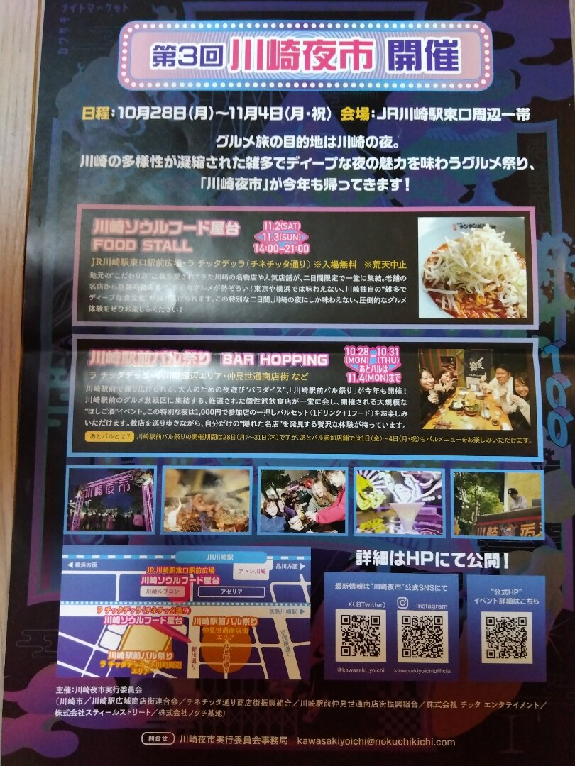 川崎駅前バル祭り、川崎ソウルフード屋台が川崎駅東口周辺一帯で開催されます☺️昼過ぎから夜まで開催されているので、日中は家族でも夜は大人で楽しめますね☺️色々なお店のバルセットが少しずつ楽しめるはしご酒も楽しそうです。