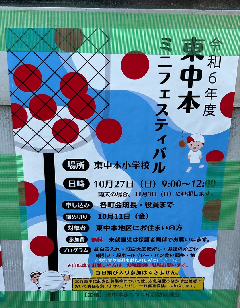 東中本地区にお住まいの方を対象としたイベントです。プログラムは紅白玉入れ・紅白大玉転がし・お猿のかごや・綱引き・段ボールリレー・パン食い競争などです。参加費は無料ですが飛び入り参加は不可、未就園児は保護者同伴で参加できるようです。参加賞や賞品もあるそうです。